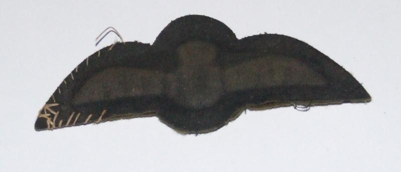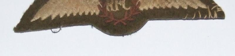 A WW1 Royal Flying Corps wings breast badge. Buff and tan on a khaki green background. Padded, with a black cloth backing. Some mothing to the badge edges.
