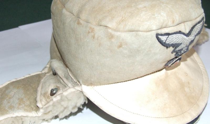 A Luftwaffe sheepskin winter cap. Sheepskin lining and ear flaps. Machine embroidered Luftwaffe eagle and cockade to the front. Considerable staining to outer cap. Ear flaps have press-stud openings to allow the wearer to use a radio headset.