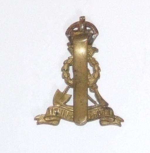 A brass cap badge for the Royal Pioneer Corps. Kings Crown. With beret slide.