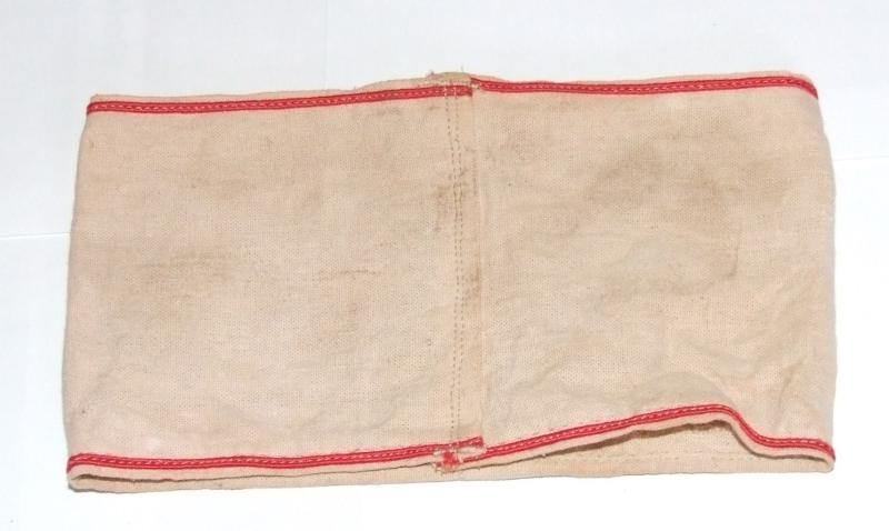A Luftwaffe flak auxiliary - Flakhelfer - armband. Blue Luftwaffe eagle printed into a discoloured white cloth armband. Thin red embroidered band top and bottom indicating a leader.