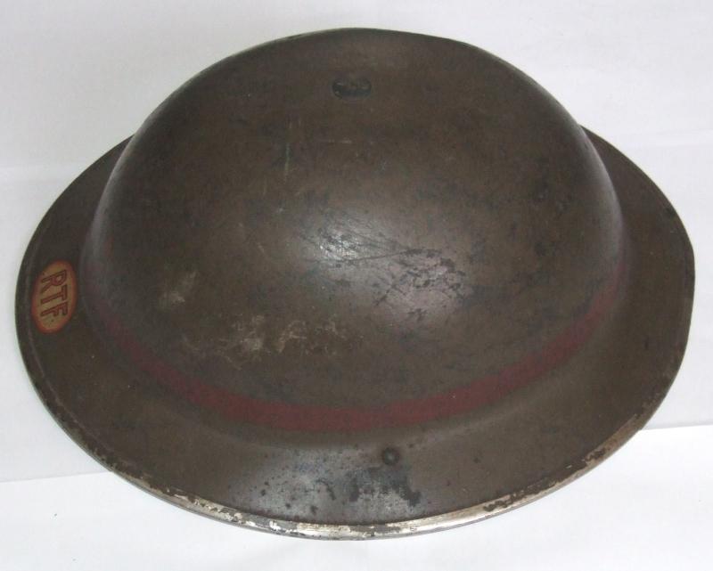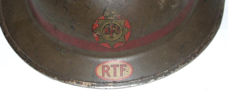 A Brodie MkII steel helmet for the National Fire Service Rescue Task Force. Green painted helmet with a red leader's band. NFS decal to the front and the initials RTF in an oval on the outer rim where the divisional number would normally be. Small dent to the right of the crown. Very slight deformation of the rim. Shell stamped BMB (Briggs Motor Bodies) with an illegible date. Liner and crown pad intact. Liner with size mark 7 and a 1938 date. Part elasticated chinstrap