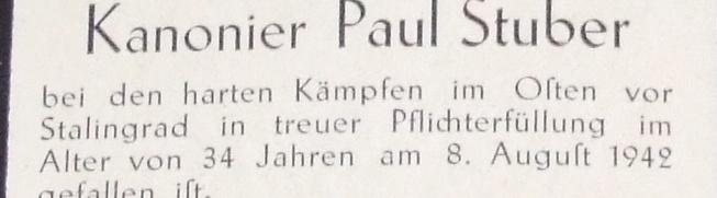 A death card for a Stalingrad casualty - Kanonier Paul Stuber, an artilleryman killed at Stalingrad on August 8, 1942