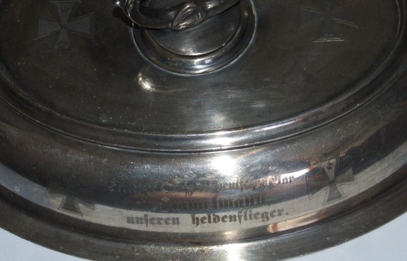 A heavy silver German Air Force WW1 mess serving dish with lid, with an engraved tribute to German fighter ace Max Immelmann. 26cm wide dish with ornate handle. Engraved with two Iron Cross representations dated 1914. Engraved legend pays tribute to the renowned pilot. Base is maker marked by Jon Wagner & Sohn and stamped Feinsilber Alpaka Auflage. Immelmann flew a Fokker E1 single seat fighter in France under the 6th Army Flying Corps. He was awarded the Order Pour la Merite after downing 15 enemy aircraft. He was killed in June 1916 when his plane broke up.