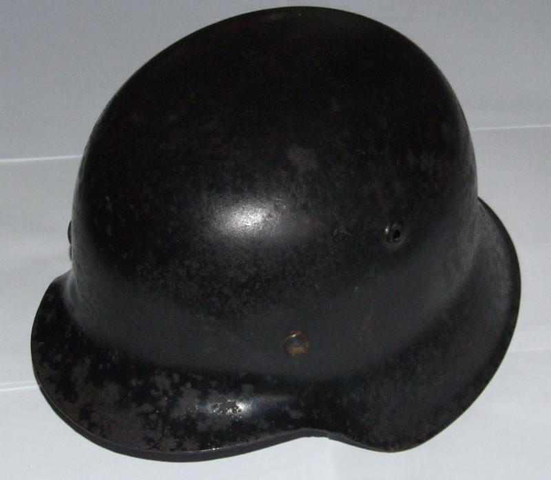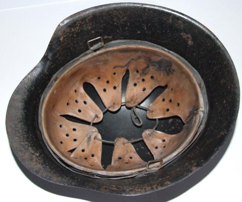 A large M42 single decal helmet for the SA - Sturm Abteilung. Raw-edged helmet painted black inside and out. Single SA insignia decal. Inner skirt stamped with batch number 5175, and maker and size stamp ckp66. Brown nine-tongued hide liner. No chinstrap but bales are present. By the middle of the war, the SA had lost much of its influence and was little more than a training organisation