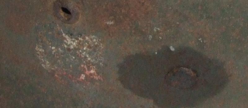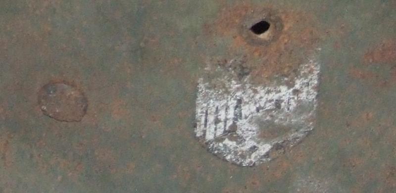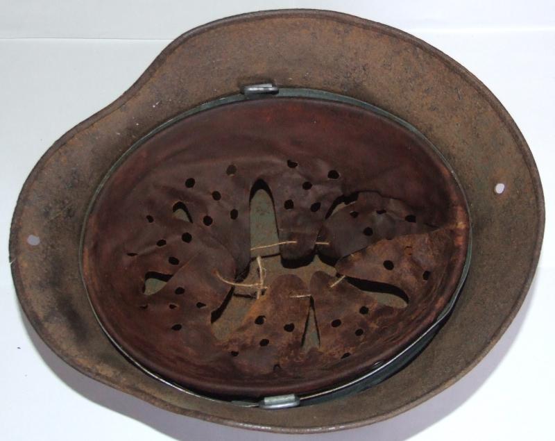An army M35 double decal helmet. Field green paint inside and out, with extensive pitting on the outside shell. Three-inch stack mark on crown. A hole is punched in the front rim which has caused a small crack. A similar hole is punched into the rear skirt, possibly for a carrying strap. Vents are rusted in place. Eagle decal is 60 per cent intact with most of the top of the eagle obliterated by rust. National decal is 30 per cent intact. No visible batch number or size stamp but seems to be a 64. Hide liner in fair condition. No chinstrap, but chinstrap bales present