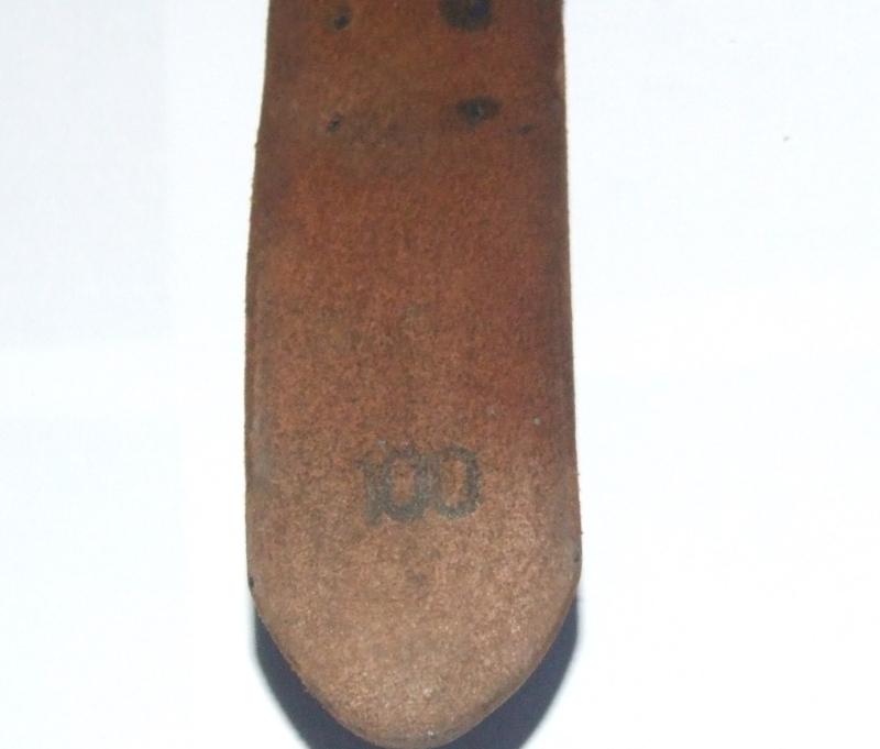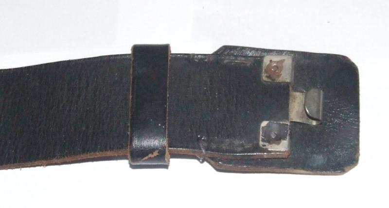 A 100cm Wehrmacht leather belt, without a buckle. Black leather belt has steel fittings, strap for attaching to buckle and a leather buckle backing. Size stamp on reverse.