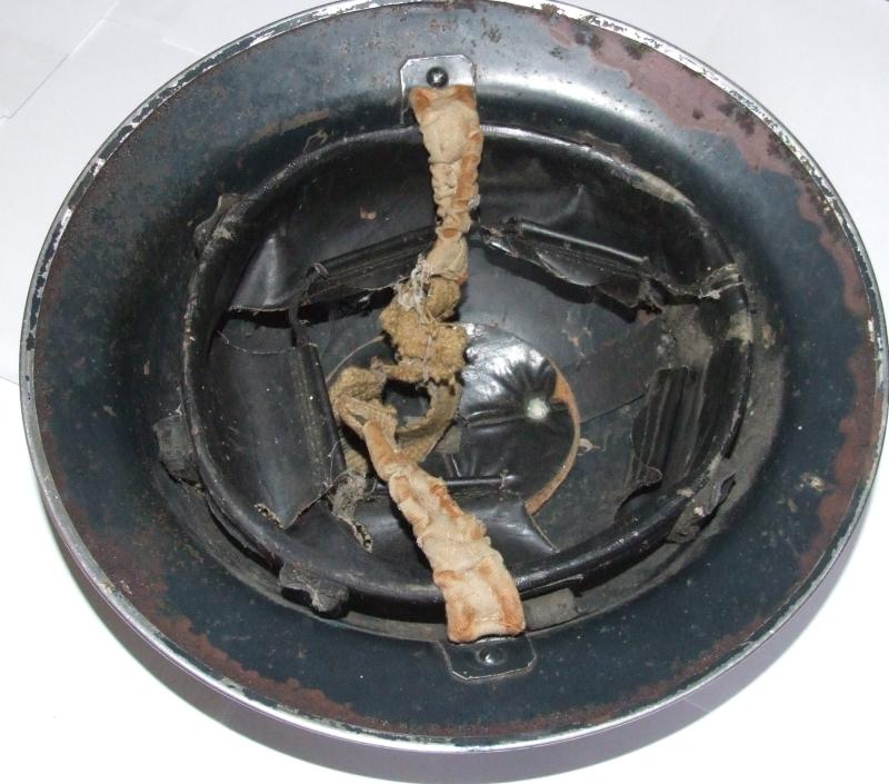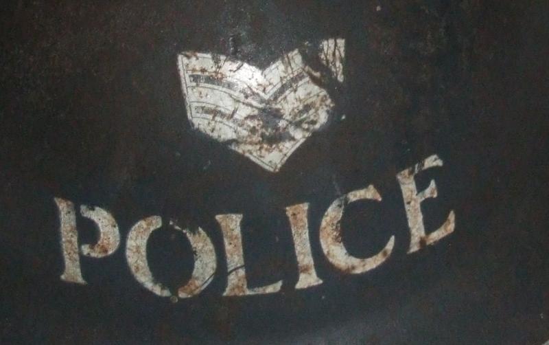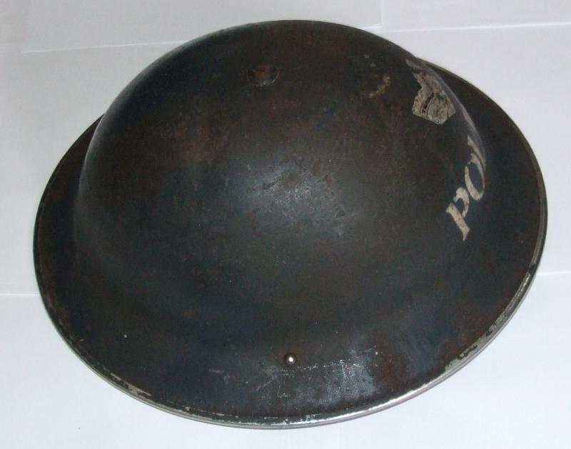 A MkII Brodie helmet for a Police sergeant. Black painted helmet inside and out with normal age wear. POLICE stencilled onto front of helmet in white, with sergeant's rank stripes. Shell has MBH maker stamp and a 1938 date. Liner and crown pad intact. Liner stamped with a 1938 date and a size 7.
