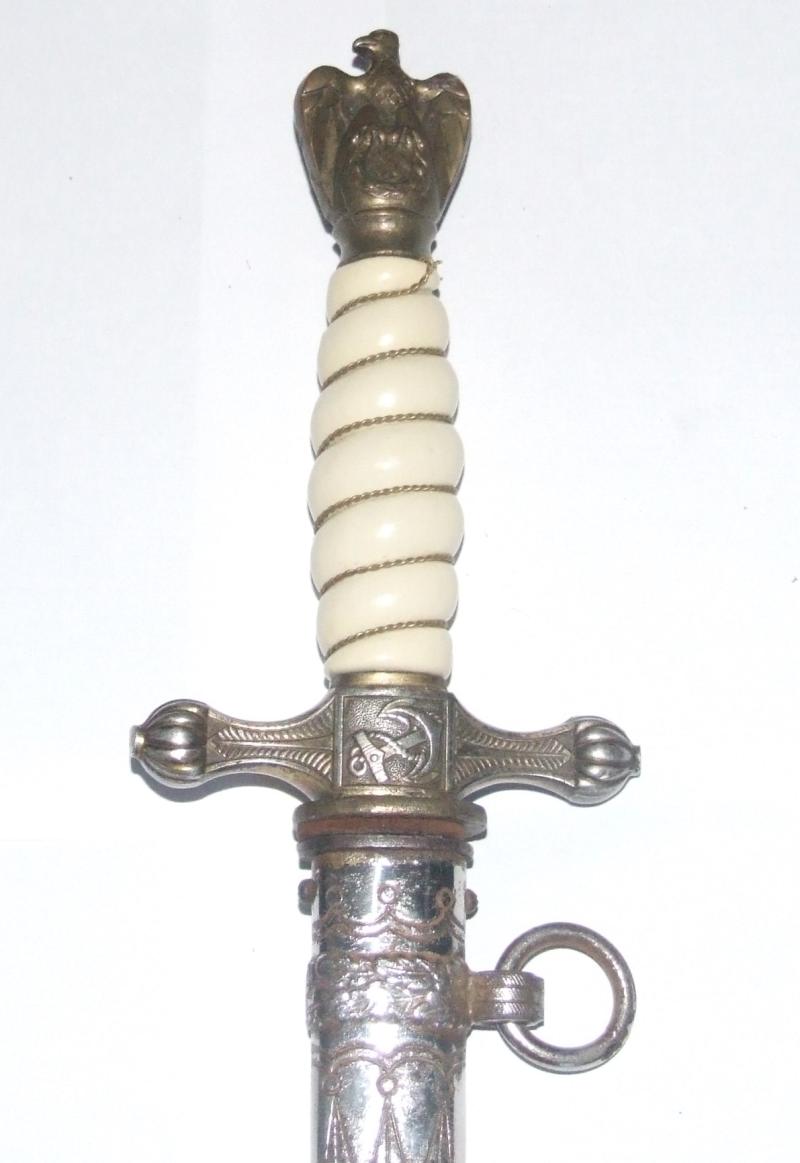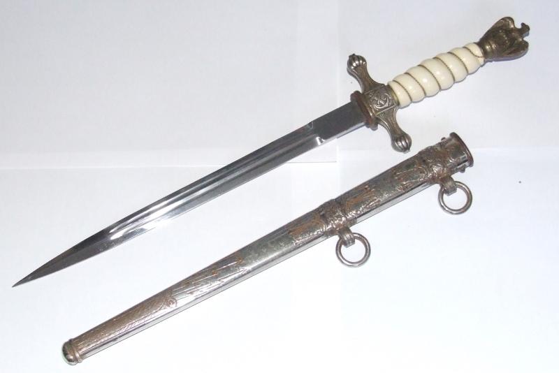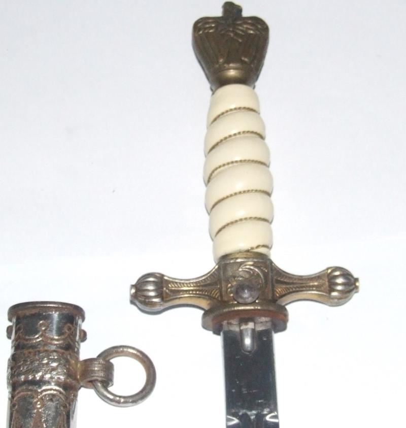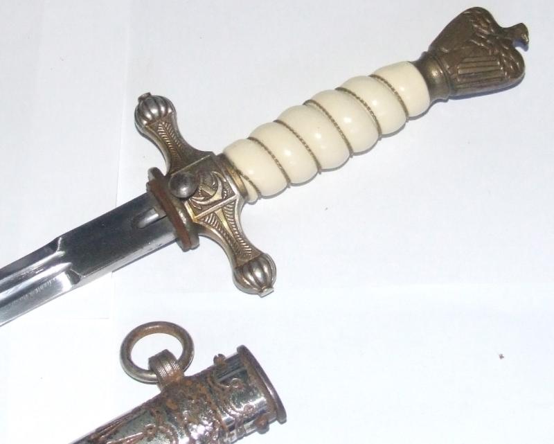 A late war example of a Kriegsmarine officer's dagger. White bakelite handle with wire wrapping. Gilded furniture with some of the gilding worn off. Very nice condition double-fullered blade, with no engraving or maker's name. Engraved scabbard which has lost nearly all of its gilding. UK sale only. Proof of age required.