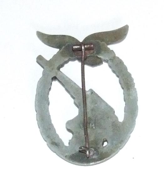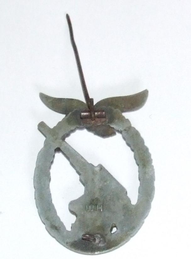 A 1957 Luftwaffe flak artillery badge by Walter and Henberg of Gablonz. Badge has no swastika beneath the eagle's feet. WH stamped. With needle pin