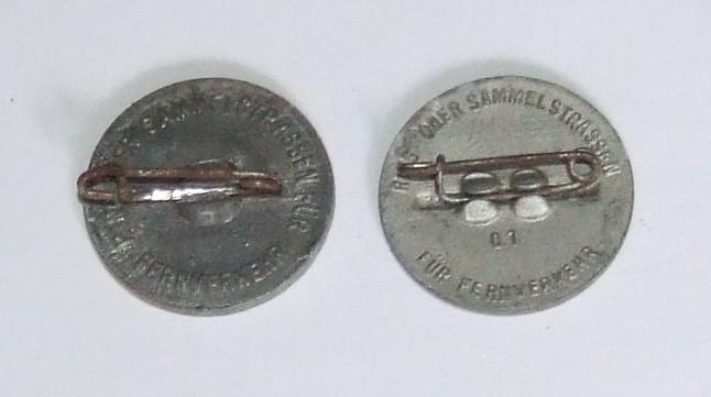 Two WHW Nazi winter help fundraising tinnies from the Fernverkehr road signs series. With clips. Extensively marked on the reverse. Price is for both.