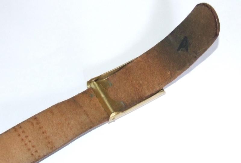 An early SS trouser belt with buckle. 100cm black leather belt, 3cm wide, with small gilt buckle with SS runes in a shield. Usually worn with civilian clothes. Steel belt clip is stamped with an Overhoff & Co maker's mark. Buckle is maker marked with a stylised W.