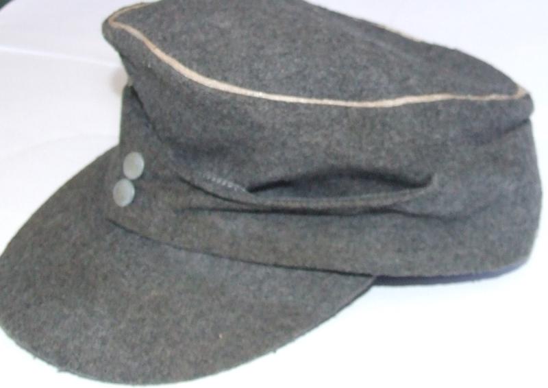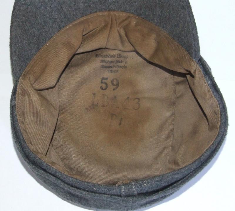 An M43 cap for an officer in the Luftwaffe. Blue/grey wool cap with silver officer's tresse around the crown. No badge but evidence of a trapezoid badge can be seen. Two grey marbled flap buttons. Gaberdine cloth lining. Illegible makers mark on the inside with a 1943 date and a 59 size stamp, along with serial number LBA43Bf