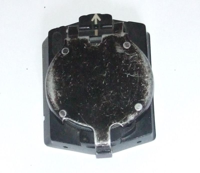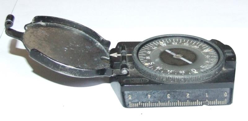 A Wehrmacht marching compass in full working order. Black bakelite frame with opening black metal cover. White and silver arrows and numbers. Maker marked clk, with serial number 4130. Five centimetre ruler to the side.