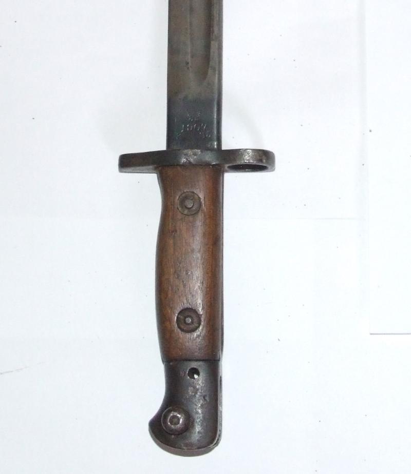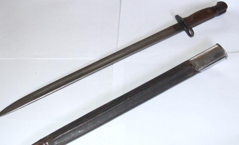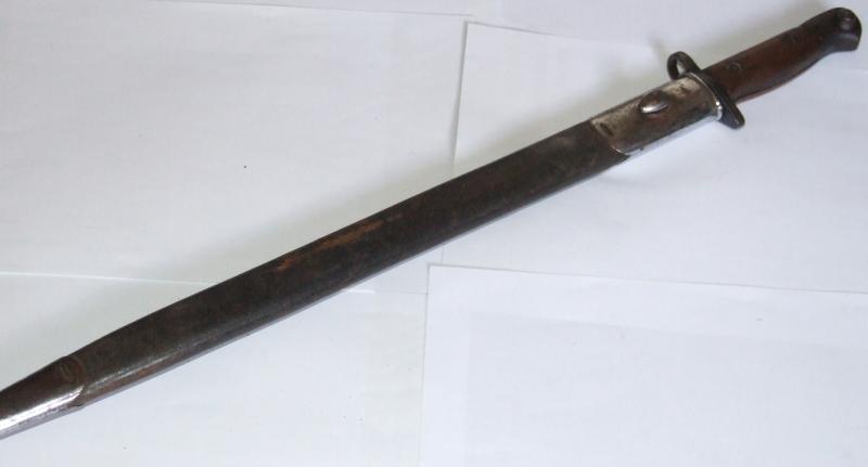 A 1907 pattern bayonet for the Short Magazine Lee Enfield (SMLE) WW1 rifle by Wilkinson. Crown and 1915 manufacture date stamped on the ricasse, along with proof marks. 41cm fullered blade in good condition. Black leather scabbard with nickel-plated furniture indicating it may have been for parade use. UK sale only. Proof of age required.