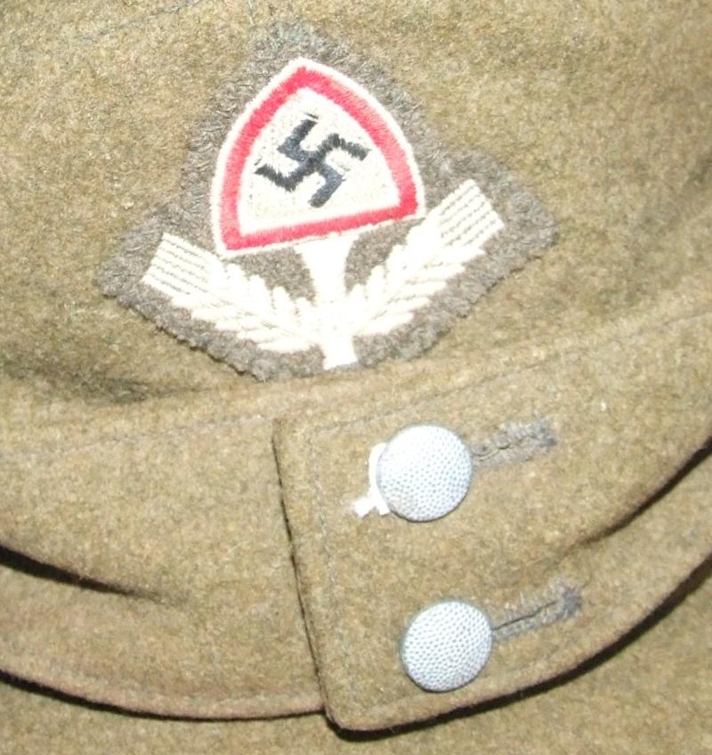 An RAD - Reichsarbeitdienst - work organisation leader's M43 cap. Olive green wool cap with two marbled flap buttons RAD insignia to the front. Green cotton lining with Schulz of Berlin maker's mark, serial number Gr11A and size 55.