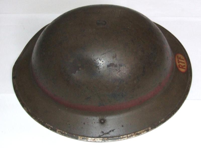 A Brodie MkII steel helmet for the National Fire Service Rescue Task Force. Green painted helmet with a red leader's band. NFS decal to the front and the initials RTF in an oval on the outer rim where the divisional number would normally be. Small dent to the right of the crown. Very slight deformation of the rim. Shell stamped BMB (Briggs Motor Bodies) with an illegible date. Liner and crown pad intact. Liner with size mark 7 and a 1938 date. Part elasticated chinstrap