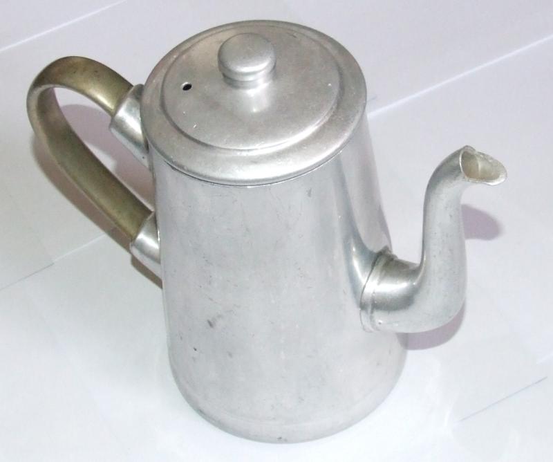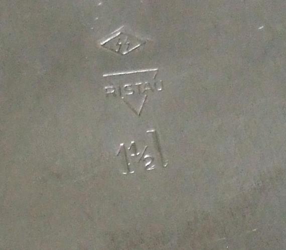 An aluminium one and a half litre coffee pot with an SS stamp. Lightweight pot has a steel handle and aluminium lid. The base is stamped with SS runes in a diamond shape, maker marked by Ristau, and a 1 1/2 litre stamp.