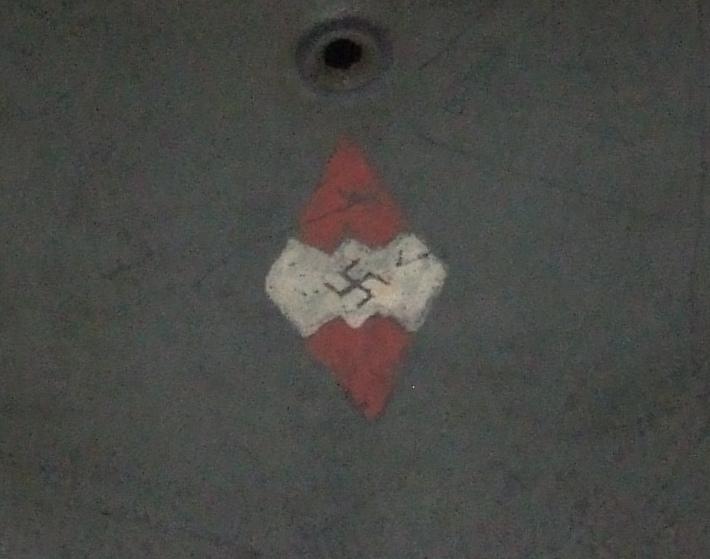 A small size M42 helmet with a painted Hitler Youth decal. Field green painted shell inside and out. HJ logo painted below vent. On the other side of the shell are the numerals 7/2 - also painted - presumably referencing the HJ Standarte. Inner skirt stamped with maker and size mark ckl62. Batch code stamping is too faint to read but appears to be 2456. Hide liner intact. No chinstrap. No official HJ decal was ever produced, so painted-on decals are not uncommon.