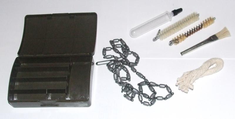 A complete late pattern cleaning kit for the Mauser K98 rifle. Chain link pull-through, barrel and breech cleaning brushes, oil bottle, surface brush and lint-free cleaning rope, contained in a bakelite box