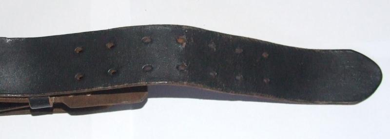 A 100cm Wehrmacht leather belt, without a buckle. Black leather belt has steel fittings, strap for attaching to buckle and a leather buckle backing. Size stamp on reverse.