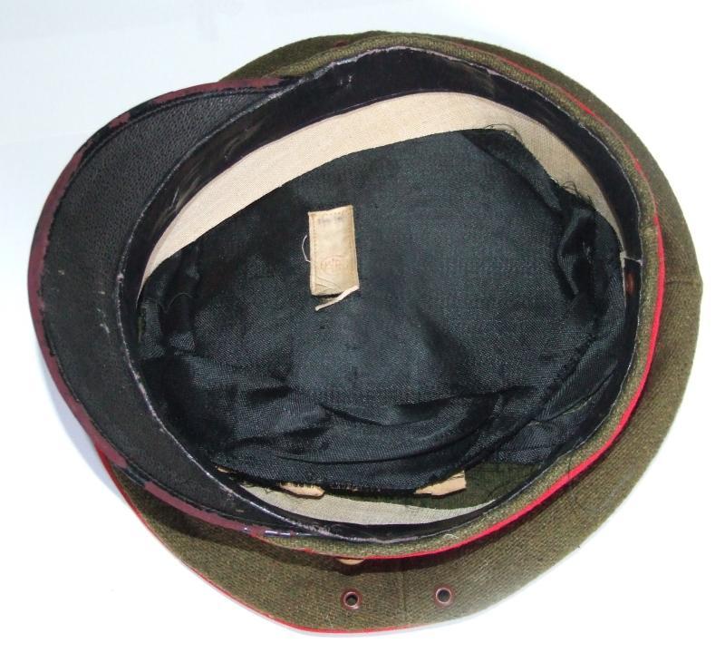 A Japanese army officers cap. Green wool cap with red band and red piping around crown. Brass Imperial star to the front. Black leather chinstrap. Black silk lining which is partially detached. Black leather sweatband. Small cotton label inside and paper labels with Japanese characters. No size marked but seems to be a 54.