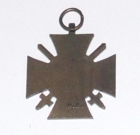 A WW1 Cross of Honour - sometimes called the Hindenburg Cross - with swords. A nicely defined example. Awarded by the NSDAP to WW1 combatants. Maker marked WR on the reverse.